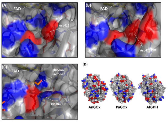 Comparison of the surface charge around the substrate entrance of (A) AnGOx (PDB code: 1CF3), (B) PaGOx (PDB code: 1GPE), and (C) AfGDH (PDB code: 4YNU). (D) Whole structure of these enzymes, and black squares show the substrate entrance. The red colored region shows the negatively charged residue, and the blue region shows the positively charged residue. Structure visualization was conducted using the PyMOL Molecular Graphics System, Version 2.2.3 Schrödinger, LLC.