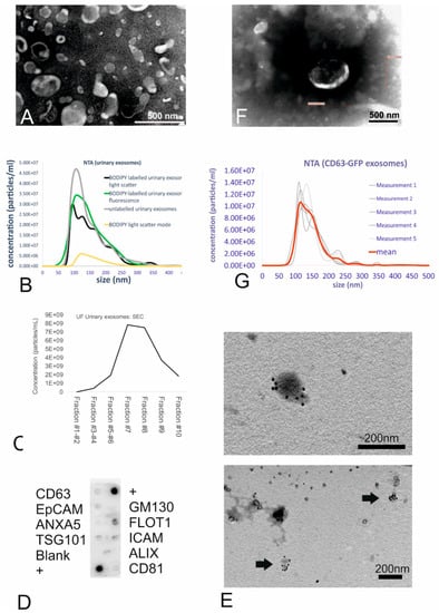 Isolation, characterization, and labelling of the urinary small extracellular vesicles (EVs). (A) TEM images of the small EVs obtained using ultrafiltration (UF). UF samples showed intact cup-shaped double-membrane structures. Scale bar = 0.5 µm. (B) Nanoparticle tracking analysis (NTA) showing the size distribution of the urinary small EVs (both unlabelled and BODIPY-labelled). The graph shows the concentration on the Y-axis and size distribution on the X-axis. (C) Size-exclusion chromatography of unlabelled urinary small EVs revealed small EVs (peaks in the particle count graph) in fractions 6–8. (D) Exo-Check antibody array showing the presence of the following exosomal markers in the ultrafiltrated small EV urinary samples: FLOT1, ICAM, TSG101, CD81, and CD63. (E) Immunogold TEM (urinary small EVs) showing the presence of CD63 tetraspanin, an exosomal marker, in vesicles in the UF sample. (F) TEM of the ultrafiltrated medium collected from the CD63-GFP transduced human fibroblasts shows some structures displaying typical exosome features. Scale bar = 0.5 µm. (G) NTA of the genetically tagged fibroblast-derived small EVs: Analysis displays the light-scatter results (small EV mean size of 146 nm).