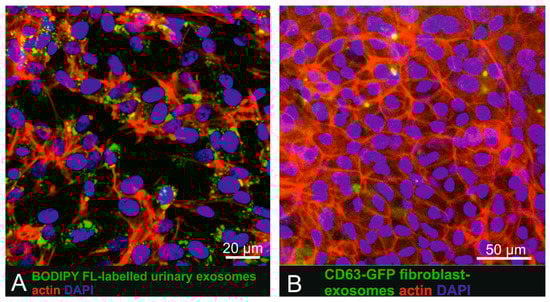 Uptake of urinary BODIPY-labelled small EVs and CD63-GFP tagged fibroblast-derived small EVs in human iPSC derived RPE cells. (A) Incubation of iPSC-derived RPE cells with BODIPY-labelled small EVs. (B) iPSC-derived RPE cells exposed to CD63-GFP fluorescent tagged primary fibroblast-derived small EVs also showed intracellular exosome localization.