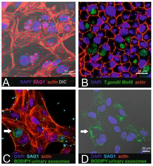 ARPE-19 cells were seeded onto 8-well slides (ibidi µ-slide, Gräfelfing, Germany) at a density of 20,000 cells/cm2. After 8 h, the cells were infected with freshly purified T. gondii ME49 tachyzoites (2 × 104 parasites per cm2). After 24 h, 108 BODIPY-labelled urinary small EVs were added to each well and incubated for another 16 h. The specimens were fixed in freshly prepared 2% PFA (20 min, RT). Following washes in PBS, the cells were permeabilized in acetone:methanol (1:1) for 20 min at −20 °C. After washes in 0.025% Tween-20 in PBS, the infected cells were incubated overnight at 4 °C with a surface-antigen-1 mouse monoclonal antibody (anti-SAG-1, 1:100 in PBS) as described in []. Following several washes in PBS, the cells were incubated for 45 min with 1 mg/mL Cy3-conjugated goat anti-mouse IgG antibody (1:400 dilution, Jackson ImmunoResearch 115-165-062, Cambridgeshire, UK). Nuclear counterstaining was performed using Hoechst (1 µg/mL. Sigma). Thereafter, the slides were mounted in Fluoromount (Sigma), placed onto glass slides and imaged using a confocal microscope (Zeiss LSM 880, Feldbach, Switzerland).