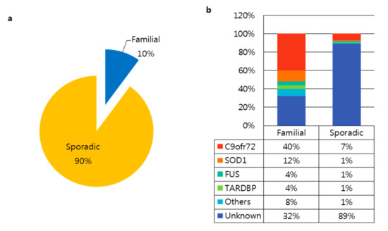 Genetic causes of amyotrophic lateral sclerosis (ALS). (a) Prevalence of familial and sporadic ALS cases. (b) Proportion of causative genes in familial and sporadic ALS [25].