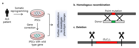 Genome editing using CRISPR/Cas9 is used in disease research to study genetic modifications in various cell types. Many years ago, mutagenesis or mutant transfection was widely used to investigate the genetic effects of mutations on disease [31,36]. Since the development of reprogramming technology, somatic cells have been used for induced pluripotent stem cell (iPSC) generation [37]. These iPSCs have the potential to differentiate into various cell types, such as neurons, liver cells, myoblasts, and cardiomyocytes. Patient-derived iPSCs provide an unlimited source of cells with which to study and treat disease [38,39,40,41]. For genetic disorders in particular, pathologic effects of mutations can be investigated in iPSCs using CRISPR/Cas9 to correct mutations (Figure 2a). The correction of specific mutations related to ALS can thus provide important insights into both verifying the pathologic effects of these mutations and identifying targets for therapeutic interventions.