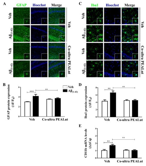 2.1. Co-Ultra PEALut Prevented the Protracted Activation of Hippocampal Astrocytes and Microglia Induced by Aβ(1–42) Challenge