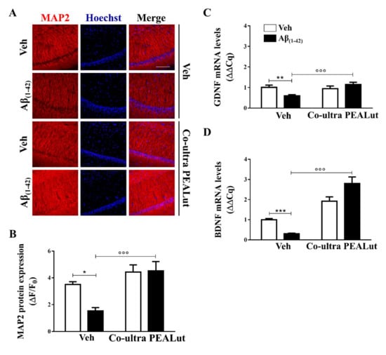 Chronic treatment with co-ultra PEALut promoted neuronal survival impaired by Aβ intracerebral injection and normalized gene expression of neurotrophic factors, lowered by intrahippocampal injection of Aβ(1–42). (A) Representative fluorescent photomicrographs of MAP-2 (red) staining in the CA1 hippocampal subregion, ipsilateral to Aβ(1–42) (or vehicle) injection site, obtained from rats chronically treated with either co-ultra PEALut (5 mg/Kg/die) or vehicle. Nuclei were stained with Hoechst (blue). Scale bar is 100 μm; (B) Quantification of MAP-2 fluorescent signal expressed as the ratio of the difference between the mean fluorescence of the sample and the background (ΔF) to the fluorescence of the non-immunoreactive regions (F0); Gene expression of GDNF (C) and BDNF (D), expressed as ΔΔCq, in the hippocampus of rats inoculated with Aβ(1–42), or vehicle, chronically treated with either co-ultra PEALut (5 mg/Kg/die) or its vehicle. Data are presented as mean ± SEM of four independent experiments performed in triplicate. * p < 0.05, ** p < 0.01, and *** p < 0.001 versus Veh/Veh; °°° p < 0.001 versus Aβ/Veh; Bonferroni’s multiple comparisons test.