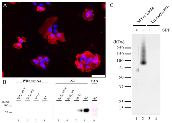(A) A3 antigen in MT-9 cells. A3 antigen appears diffusely on the cell surface of MT-9 cells. Furthermore, fine granular reactions to A3 are also observed in the cytoplasm of MT-9 cells. Scale bar = 50 μm. (B) A3 reactivity. In Western blotting without the primary antibody, A3 does not show any signals in lanes 1–4. Samples treated with a reducing reagent (BME) lose their antigenicity in lanes 5 and 6. Specific A3-signal band is observed at 75–100 kDa in lanes 7 and 8. The strongest A3-signal band is observed in a sample incubated at RT without BME in lane 8. A weaker signal is also observed in a sample incubated at 95 °C without BME in lane 7. PAS, periodic acid-Schiff; BME, 2-mercaptoethanol and RT, room temperature. (C) Glycodigestion. A3 antigen digested with glycopeptidase F (Lane 1) and intact A3 antigen (Lane 2) were analyzed by Western blotting for A3. For the negative control, control glycoprotein with glycopeptidase F (Lane 3) and intact glycoprotein without glycopeptidase F (Lane 4) were analyzed by Western blotting for A3. GPF, glycopeptidase F.