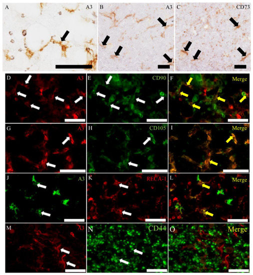 A3-labeled cells in the adult rat bone marrow. (A) A3-labeled cells are spindle- and polyhedral-shaped stromal cells. (B,C) The localization is similar partly to CD73-positive cells in the consecutive sections. (D–L) A3-labeled cells are corresponding to some cells reacting to CD90 (D–F), CD105 (G–I) or RECA-1 (J–L). (M–O) The localization of A3-labeled cells is different from that of CD44-positive cells. Black and white arrows indicate positive signals. Yellow arrows indicate colocalization in merge immunofluorescence. Scale bars = 50 μm.