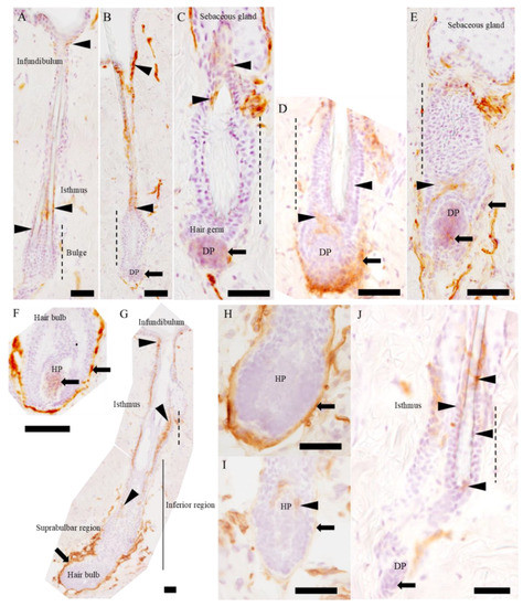 - Ichikawa, C.; Izawa, T.; Juniantito, V.; Tanaka, M.; Hori, M.; Tanaka, K.; Takenaka, S.; Kuwamura, M.; Yamate, J. Rat hair follicle-constituting cells labeled by a newly-developed somatic stem cell-recognizing antibody: A possible marker of hair follicle development. Histol. Histopathol. 2013, 28, 257–268. [Google Scholar] [CrossRef]