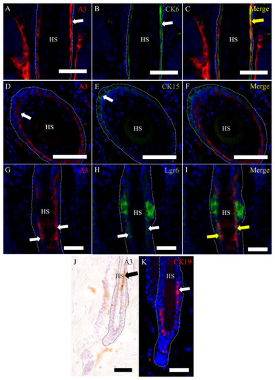 Characteristics of A3-labeled epithelial cells in the hair cycle. (A–C) A3 labels epithelial cells under the companion layer expressing CK6. (D–F) A3 labels epithelial cells above the basal layer expressing CK15. A3-labeled cells show partly colocalization with that for Lgr6. (G–I) The distribution of positive cells to A3 and CK19 (J,K; J for A3 and K for CK19) is almost similar to each other. Black and white arrows indicate positive signals. Yellow arrows indicate colocalization in merge immunofluorescence. HS, hair shaft. Dot lines indicate the basal membrane. Scale bars = 50 μm.