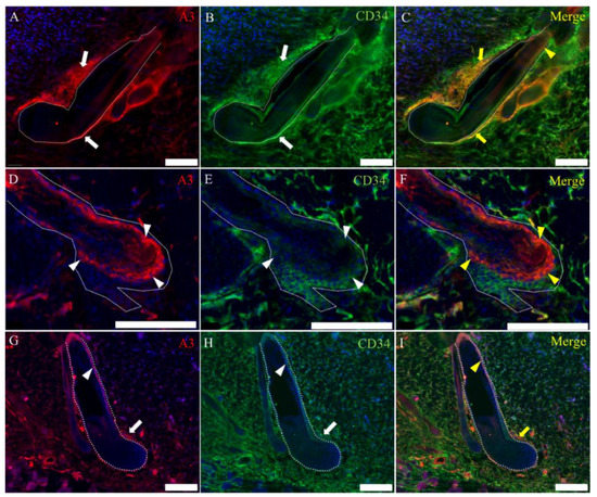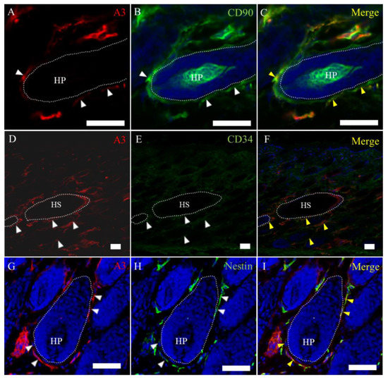 Characteristics of A3-labeled mesenchymal cells in the hair cycle. (A–C) A3 reacts to cells showing positive reaction to CD90 around the hair bulb. (D–F) CD34-positive cells are diffuse in the dermis; some of the CD34-positive cells react to A3. (G–I) A few cells show coexpression to A3 or nestin around the hair bulb. White arrowheads indicate positive signals. Yellow arrowheads indicate colocalization. HP, hair papilla and HS, hair shaft. Dot lines indicate the basal membrane. Scale bars = 50 μm.