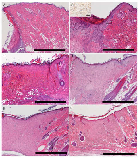 The wound-healing process. (A) In the inflammatory stage, the wound is covered by debris/degenerative cells and reactive cells such as neutrophils, fibrin and hemolyzed red blood cells, forming a crust. The epidermal layer is thin at the edge of the wound, and the hair follicles at the wound edge show the catagen phase on post wound (PW) day 1. (B) Thickened epidermis is formed from the surrounding cutaneous tissue; in the wound bed, granulation tissue with myofibroblasts (square is the inset showing the increased number of myofibroblasts reacting to α-SMA; scale bar = 20 μm) develops. (C,D) In the late-proliferative and early remodeling stages, the hair follicle at the wound edge shows anagen, and the thickened re-epithelialized epidermis is clear. (E,F) In the remodeling stage, the hair follicle shows catagen, and the epidermal thickening declines to the control level. A, PW day 1; B, PW day 5; C, PW day 9; D, PW day 15; E, PW day 20 and F, PW day 26. Scale bars = 1 mm.
