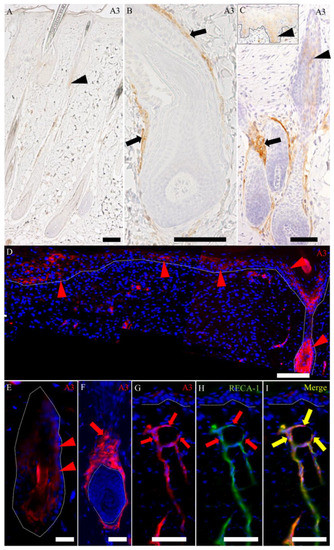 In the wound-healing process, an A3-positive reaction was seen in both the epithelial and mesenchymal components of the hair follicles (Figure 7B,C), as well as the re-epithelialized epidermis continuing to the hair follicle at the wound edge (Figure 7C; inset and D); especially, the signal intensity was upregulated at the late-proliferative-to-early remodeling stages (Figure 7B–D). This signal intensity declined in the late-remodeling stage (Figure 7E,F), although these mesenchymal and epithelial intensities in the hair follicle were still greater than that in the control skin (Figure 7A). These findings indicated that A3 labels both epithelial and mesenchymal cells, contributing to the wound healing; especially, the A3-labeled epithelial cells are important for re-epithelialization at the late-proliferative-to-early remodeling stages of the wound-healing process. The epithelial cells of the re-epithelialization might be immature in nature, because they reacted to A3. Additionally, pericytes around the newly formed blood vessels in the granulation tissue reacted to A3 (Figure 7G–I), as reported previously [14].