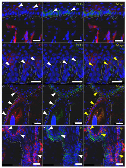 Double immunolabeling with A3 and CK15 antibody in the early remodeling stage. (A–C) A3 labels suprabasal cells, which are contiguous to CK15-positive cells in the re-epithelialized epidermis. (D–F) In epidermal invaginations, CK15 reacts not only to basal cells but also to suprabasal cells, which are labeled by A3. (G–L) The colocalization of A3 with CK15 is also observed at the infundibulum (G–I) and bulge region (J–L) in the hair follicle at the edge of the wound bed. (A–L) Samples on PW day 15. White arrowheads indicate positive signals. Yellow arrowheads indicate colocalization. Dot lines indicate the basal membrane. Scale bars = 20 μm.