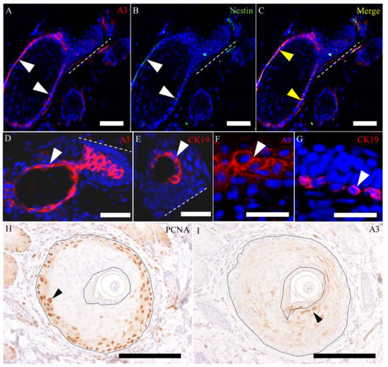 The characteristics of A3-labeled epithelial cells in the late-proliferative and early remodeling stages. (A–C) A3 reacts to nestin-positive epithelial cells around the bulge. (D–G) The A3- and CK19-labeled epithelial cells (D,F) are seen around the bulge (E) in the figures of D and F and in the re-epithelialized epidermis (G) in the figures of F and G. (H,I) Proliferating cell nuclear antigen (PCNA)-positive proliferating cells are located in the outer few layers in the outer root sheath, although A3 reacts to the inner cells of the outer root sheath, except for the basal cells. White arrowheads indicate positive signals in the epithelial elements. Yellow arrowheads indicate colocalization. (A–G) Samples on PW day 15 and (H,I) samples on PW day 9. Dashed lines in A–D and E indicate the bulge region, and dot lines in H and I indicate the outer root sheaths. Scale bars (A–C,H,I) = 40 μm. Scale bars (D–G) = 20 μm.