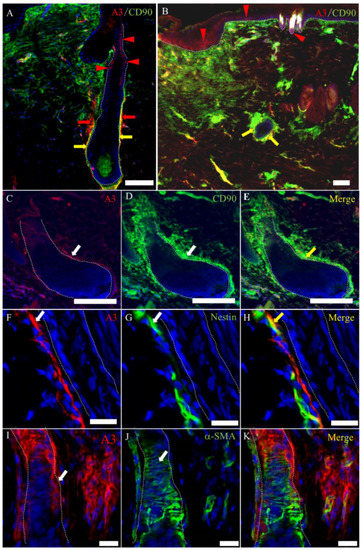 The characteristics of A3-labeled mesenchymal cells in the late-proliferative and early remodeling stages. (A–E) A3 reacts to the expanded immature mesenchymal cells, which coexpress CD90 in the connective tissue sheath of the hair follicle in the proliferative and remodeling stages. CD90 also reacts to the mesenchymal cells in the granulation tissue, especially beneath the re-epithelialized epidermis. (F–H) A3 reacts to some nestin-positive cells. (I–K) A3-labeled cells are around the hair follicle. α-SMA-positive cells are arranged in parallel around the hair follicle. (A,B) Samples on PW day 9, (C–H) samples on PW day 15 and (I–K) samples on PW day 12. Red arrowheads and arrows indicate the A3-labeled epithelial and mesenchymal cells, respectively, in (A,B). White arrows indicate positive signals for mesenchymal cells in (C,D,F,G,I,J). Yellow arrowheads and arrows indicate colocalization in A, B, E, and H. Dot lines indicate the basal membrane. Scale bars (A–E) = 100 μm. Scale bars (F–K) = 20 μm.
