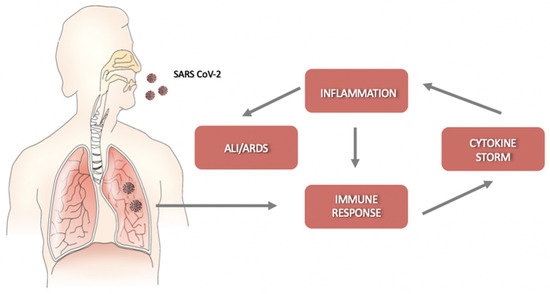 Helper T cells secrete cytokines that regulate and assist the immune response; cytotoxic CD8+ T cells (CTLs) recognize and kill the infected cells. They release pro-inflammatory cytokines, perforins, and granzymes to induce programmed cell death [19]. However, the cytokines produced by CTLs can damage uninfected as well as virus-infected cells, and their massive production may cause detrimental effects, leading to acute lung injury. SARS-CoV-2 infection is characterized by a rapid viral replication that triggers an amplified immune response with the activation of a cytokine storm. The consequent massive inflammation and increase in vascular permeability induce an abnormal accumulation of neutrophils, macrophages, inflammatory monocytes, and lymphocytes in the lung alveoli, further increasing cytokine production [20]. In this condition, the regulation of the immune response is lost, and the cytokine storm is further activated. Without therapeutic intervention, the development of ALI/ARDS and permanent alterations in lung functions may result in dire consequences [4] (Figure 1). Moreover, the circulation of cytokines to other organs can lead to multi-organ damage.