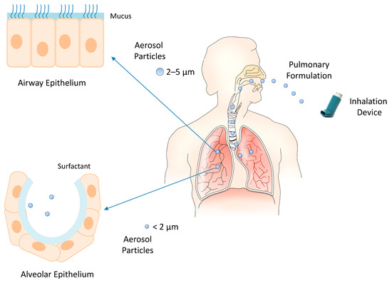 The inhalation devices play a crucial role in the effectiveness of pulmonary drug administration. The most common devices are nebulizers (e.g., jet nebulizers, ultrasonic nebulizers, and vibrating mesh nebulizers), metered-dose inhalers, and dry powder inhalers [62]. The selection of the inhalation device depends on the physicochemical characteristics of the drug and its formulation. Liquid formulations are administered by nebulizers and metered-dose inhalers, and solid formulations by dry powder inhalers. In each case, the inhalation device provides aerosol particles whose size can control the extent of inhaled drug accumulation and the site of drug deposition within the airways. Smaller particles achieve a greater total drug accumulation in the lungs and farther distal airway penetration compared with larger particles. Particles smaller than 5 μm in diameter may flow in the airstream beyond the retro-pharynx and reach the trachea. Particles of 2–5 μm in diameter are deposited in the upper respiratory tract at the level of the trachea and tracheal bifurcation. Particles smaller than 2 μm in diameter deposit in the lower airway and alveolar epithelia [63,64]. Then, the modulation of intrapulmonary deposition through the control of the aerosol particle size can appreciably improve the inhalation drug therapy (Figure 2). The pulmonary administration of drugs mainly provides a local therapy but may also provide a systemic therapy when the physicochemical characteristics of the drugs can support their absorption through the alveolar epithelium at extents suitable to elicit systemic effects. Indeed, the large surface area, extensive vascularization, and single-cell barrier in the alveoli make the lungs an appropriate portal for the systemic absorption of molecules, such as insulin, human growth hormone, etc. [65].
