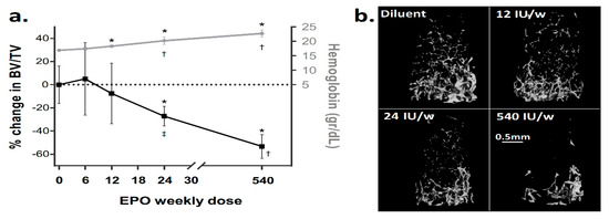 Erythropoietin (EPO) induces dose-dependent trabecular bone loss. (a) Relationship between the hemoglobin level (grey) and the extent of reduction in BV/TV (black) at different doses of EPO. The values on the X axis represent a total weekly dose of EPO administered to 10-week-old female mice for two weeks. Values on the Y axis are mean ± SD; n = 3 for 6 and 12 IU, n = 7 and 8 for 24 and 540 IU, respectively. (b) Representative 3D reconstruction images of the distal femoral metaphysis of mice treated with diluent or EPO at the designated doses. * p < 0.05 relative to diluent control, † p < 0.05 relative to preceding dose, ‡ p = 0.05 relative to preceding dose.
