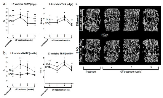EPO induces irreversible changes in the microarchitecture of the lumbar spine vertebrae. (a) Trabecular bone volume (BV/TV) and trabecular number (Tb.N) of the edge (a) and midportion (b) of the L3 vertebra from diluent (DIL) and EPO (540 IU/week)-treated female mice at the completion of the treatment period and 2, 4 and 6 weeks post treatment. Values are mean ± SD. *** p < 0.001; ** p < 0.01; * p < 0.05; (c) Representative 3D reconstruction images of the L3 vertebra (subdivided into edge- and midportions) of the mice described in (a,b). n = 6 for each group. “Edge” and “middle” portions of the vertebral body were defined as marginal (upper/lower) and middle 1/3 of the vertebral body in the axial plane.