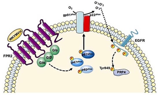Intracellular signaling cascades triggered by FPRs include the activation of different kinases and phosphatases, such as protein kinase C (PKC) isoforms, phosphoinositide 3-kinase (PI3K), protein kinase B (Akt), mitogen-activated protein kinase (MAPK), p38MAPK, PTEN, PTP-PEST, and DUSP3/VHR [12,16,17,18,19,20], as well the phosphorylation and membrane translocation of p47phox and p67phox which are required for NADPH oxidase-dependent reactive oxygen species (ROS) generation [21,22]. Furthermore, FPR1 and FPR2 induce ROS-dependent TKR transactivation, as well as the phosphorylation and nuclear translocation of regulatory transcriptional factors [12,23,24,25,26].