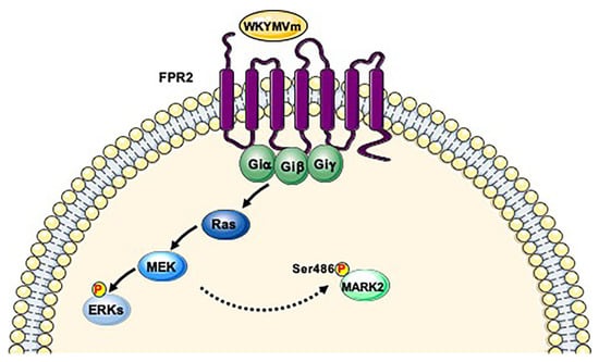 FPR2 signaling triggers MARK2 phosphorylation. FPR2 stimulation triggers Ras/MAPK pathway. We hypothesize that Ser486 residue of MARK2 is phosphorylated by not yet identified kinases downstream to Ras cascade.