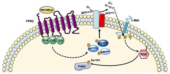 FPR2 signaling induces PI3K-mediated Ser181 phosphorylation of PAK4. Binding of WKYMVm to FPR2 induces NADPH oxidase-dependent c-Met transactivation. Phospho-tyrosine residues of c-Met trigger PI3K signaling that promote PAK4 phosphorylation.