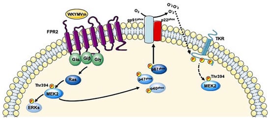 NADPH oxidase activation requires the phosphorylation of the cytosolic components p40phox, p47phox and p67phox and their translocation to the membrane, followed by their interaction with cytochrome b558 [21,22,23,24,25,26,194,195,196]. In FPRs-stimulated cells PKC- and ERK/p38MAPK-dependent pathways phosphorylate p67phox on Ser and Thr residues [197,198,199] and the inhibition of MEK activity prevents p47phox phosphorylation [200,201], suggesting that NADPH oxidase-dependent ROS generation requires MEK1/2 activity. Previously, we demonstrated that in WKYMVm-stimulated human fibroblasts FPR2 triggers MEK-dependent p47phox phosphorylation and membrane translocation, as well as NADPH-dependent superoxide production [21,22].