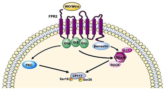 Phosphorylation of Ser16 and Ser26 of CPI-17 depends on PKC and ROCK pathway. FPR2 signaling induces PKC- and/or ROCK activation which mediate Ser16 and Ser26 phosphorylation of CPI-17. RhoA-ROCK cascade could be also activated by β-arrestin-induced signaling.