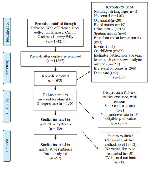 We identified 19,421 studies applying the literature search string in four databases (Figure 1), of which 11,867 studies remained after removing duplicates. Restricting the search to include only EBC, gave 893 records. We excluded 548 studies based on the title and abstract screening. Finally, we retained 86 studies where 8-isoprostane was analyzed in EBC. After reading these studies thoroughly, all 86 studies were included in the qualitative synthesis including risk of bias and quality assessment [4,15,16,17,18,19,20,21,22,23,24,25,26,27,28,29,30,31,32,33,34,35,36,37,38,39,40,41,42,43,44,45,46,47,48,49,50,51,52,53,54,55,56,57,58,59,60,61,62,63,64,65,66,67,68,69,70,71,72,73,74,75,76,77,78,79,80,81,82,83,84,85,86,87,88,89,90,91,92,93,94,95,96,97,98,99], and 52 studies into the quantitative analysis [4,15,17,18,19,20,21,22,23,25,26,28,29,30,31,35,38,39,40,44,46,47,48,49,50,51,52,53,54,55,57,59,60,62,63,64,74,75,77,79,80,81,82,84,85,86,88,89,90,93,95,99]. In the quantitative analysis, ten studies were excluded because no information was provided to estimate variability (GSD). Another 12 studies were excluded because their coefficients of variation (CV) were beyond acceptance limits (greater than 10% and lower than 200%). Only 12 studies out of the remaining 64 reported using chemical analytical methods. We therefore decided to include only studies using immunological methods. This resulted in 52 studies for the meta-analysis.
