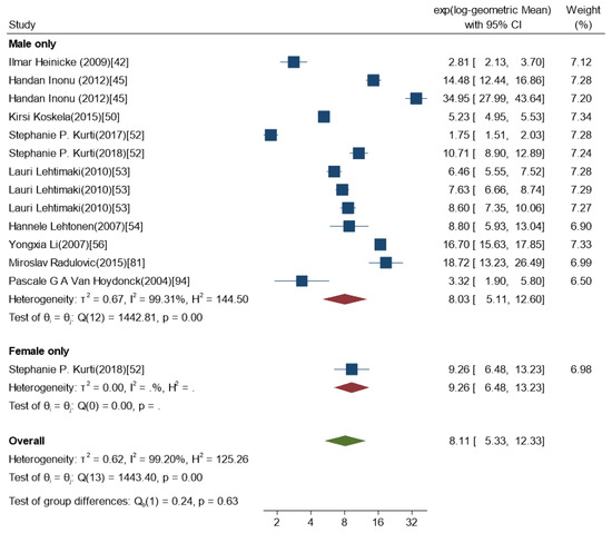 We conducted the meta-analysis on healthy subjects aged 18+ years, exclusively. Participants were divided into subgroups depending on their gender. In total, within the 52 studies included in the meta-analysis, we considered 62 subgroups of participants included, with 1980 participants in overall. We had 322 participants in the males only subgroup, and 12 participants in the females only subgroup. The mean age of the subgroups was 44.90 years with standard deviation (SD) 11.61. Participants were 54% males and 46% females. Only 18 studies reported BMI [15,17,18,22,25,31,38,43,47,48,53,57,64,82,84,86,90,95]. Among them 65% reported BMI higher than 25. The between-study heterogeneity was very high (I2 = 99.22%) and the mean 8-isoprostane concentration was 7.97 pg/mL with a 95%-confidence interval (95%CI) between 6.46 and 9.85. The heterogeneity remained high even after stratifying by gender, I2 = 99.19% for studies with mixed gender groups (both males and females) (Figure 2) and I2 = 99.20% for studies with specific gender groups (only males or females) (Figure 3). Due to the high heterogeneity, a meta-regression of all the study groups mostly reflected differences between studies rather than any actual effect of determinants considered. For that reason, a mixed model with study ID as a random effect appeared the most relevant.