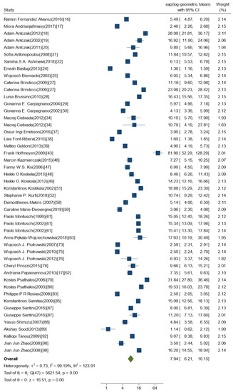 We aimed to determine the reference range values of 8-isoprosante in EBC of healthy adults. In the meta-analysis, we calculated geometric means (GM) and geometric standard deviations (GSD) because the values of 8-isoprosante were generally log-normally distributed [115]. The heterogeneity of the original data corresponded to GM and GSD. We followed the instructions of the standard practice in meta-analysis [117], and we represented the data as forest plots including the I-square statistics that estimates the percentage of the between-study heterogeneity. When I-square is high, we used mixed model with study ID as a random effect. Our results were provided on the study subgroup level, rather than on the individual level. We used STATA, version 16 software for data management and statistical analyses.