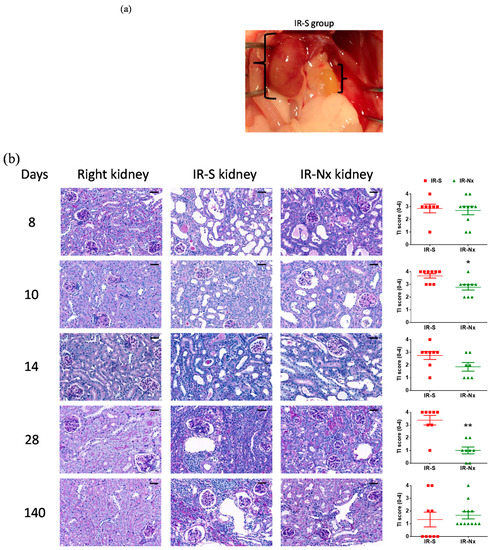 Macroscopically, the postischemic kidneys were at least 50% smaller than the healthy contralateral kidneys on days 28 and 140 in the IR-S groups, and they appeared pale, suggesting hardly any blood perfusion (Figure 4a). On the other hand, the postischemic kidneys appeared normal in the IR-Nx groups.