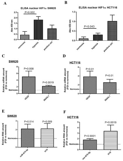 CRC cell lines up-regulated miR-675-5p and lncH19 after 18 h of hypoxic stimulation. ELISA assay for HIF-1α performed with nuclear extracts of SW620 (A) and HCT116 (B) after 18 h of hypoxic stimulation, positive control was furnished by the kit and it is the nuclear extract of HeLa cells pretreated with LiCl. Data, expressed as absorbance (ABS) values at 450 nm, are the mean ± SD of three independent experiments. Real-time PCR for VEGF, SAIL1, miR-675-5p and lncH19 in SW620 (C,E) and HCT116 (D,F) stimulated for 18 h in the hypoxic chamber. MiR-675-5p data were normalized for RNU6 (RNA, U6 Small Nuclear 1) while VEGF, SNAIL1, and lncH19 levels were normalized for β-actin, ΔΔCt is expressed as fold of increase (FOI) with respect to normoxic conditions. Data are expressed as the mean ± SD of three independent experiments and p-values are indicated in the graph.