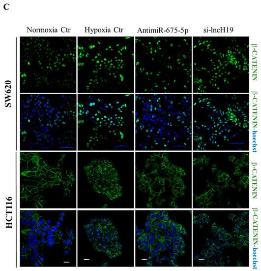 Notably, we found that the hypoxia-induced miR-675-5p expression was not abolished by lncH19 silencing, thus releasing, at least in part, the synthesis of the miR-675-5p from the long non-coding that cages it. Moreover, in our system, miR-675-5p inhibition in hypoxic cells is most effective than lncH19 silencing to inhibit β-catenin nuclear activity; the latter characteristic common to 80% of CRCs [].