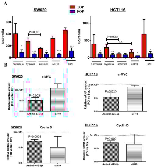 Then, we investigated the effects on β-catenin transcriptional activity induced by miR-675-5p and/or lncH19 silencing in hypoxic cells. To this aim, we transfected cells with the TOP-Flash FOP-Flash vectors that contain consensus TCF/LEF binding element (respectively, wild type or mutated) upstream of luciferase expression construct. The graphs in Figure 4A demonstrated that the transcriptional activity of β-catenin on TCF/LEF promoter is affected by miR-675-5p inhibition in hypoxic cells. As expected, no variation in the luciferase activity was revealed in response to the different treatments in cells transfected with the mutated promoter (FOP). Further confirmation was obtained by the transcriptional analysis for the β-catenin targets c-MYC and Cyclin D1, involved in regulating tumor growth and cellular proliferation. As shown by the RT-PCR graphs in Figure 4B, miR-675-5p inhibition reduced both c-MYC and Cyclin D1 expression in hypoxic CRC cell lines. While c-Myc is known to be down-regulated also by HIF complex in prolonged hypoxia [,], it is noteworthy the inhibitory effect induced by miR-675-5p on Cyclin D1 expression, which we found up-regulated in hypoxic CRC cells as shown in Supplementary Figure S2 (SF2).