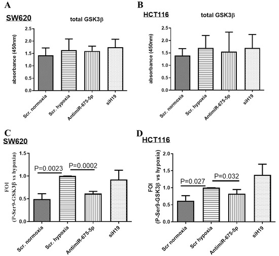 First, we evaluated the effects of miR-675-5p inhibition on GSK3β. By the use of ELISA assay, we found that the total amount of GSK3β was not affected by hypoxic stimulation, either by miR-675-5p inhibition or by lncH19 silencing (Figure 5A,B). Intriguingly, evaluating the inactive P-Ser9-GSK3β, we found that the hypoxic stimulus had an inhibitory effect on the GSK3β activity, but this inhibition was lost when the cells were transfected with antimiR-675-5p; these results indicated that miR-675-5p has a role in maintaining GSK3β inactive in hypoxic cells. In Figure 5C,D, the amount of inactive P-Ser9-GSK3β was normalized for the total amount of GSK3β in the different conditions, and reported as fold of induction versus the equivalent in hypoxic controls.