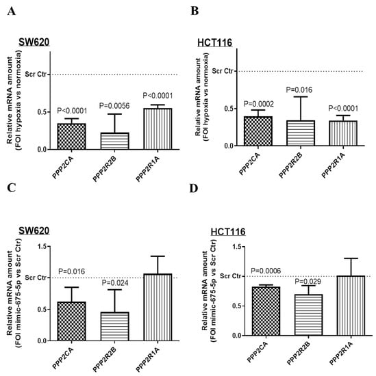 Effect of miR-675-5p on the phosphatases’ mRNA level. Real-time PCR for PP2CA, PP2R2B and PP2R1A in SW620 (A) and HCT116 (B) under normoxic condition or subjected to 18 h of hypoxic stimulation. Gene expression data were normalized for β-actin, ΔΔct is expressed as fold of increase (FOI) with respect to the expression in normoxic cells. Real-time PCR PP2CA, PP2R2B and PP2R1A in SW620 (C) and HCT116 (D) transfected with miR-675-5p mimic or scrambled negative control in normoxic conditions and subjected to 18 h of hypoxic stimulation. Gene expression data were normalized for β-actin, ΔΔct is expressed as fold of increase (FOI) with respect to the expression in scrambled negative control transfected cells. Data are expressed as the mean ± SD of three independent experiments and p-values are indicated in the graph.