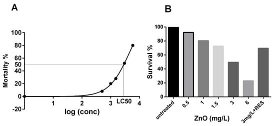 Resveratrol protects zebrafish embryos form ZnO NP-induced mortality. (A) log-dose vs. response curve for LC50 determination (see the Materials and Methods for more details). (B) The survival rate of the zebrafish embryos treated with different concentrations of ZnO NPs compared to the untreated control group and recovery assay following treatment with 5.0 µM resveratrol (3 mg/L + RES). RES, resveratrol.