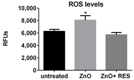 Resveratrol decreases ZnO NP-elicited pro-oxidant effect in zebrafish embryos. Quantitative analysis of ROS level in 72-hpf embryos after exposure to 3 mg/L ZnO NP in the absence (ZnO) or the presence (ZnO + RES) of 5 µM of resveratrol. Fluorescence was measured with a GENios plus microplate reader using a wavelength of 485 nm (excitation) and 535 nm (emission). RES, resveratrol. Values are shown as mean ± SD, n = 5; *, significantly different from untreated.