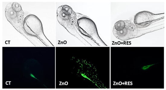 A number of different studies, many of which were conducted in aquatic organisms [16,32], including zebrafish [33,34], demonstrated that oxidative stress is a central mechanism of ZnO NP-induced toxicity. Indeed, in the aquatic environment, Zn2+ is partially released from ZnO NPs [16,33] determining, thus, an increased ROS production, which may lead to a redox status imbalance and oxidative stress if not properly counterbalanced by the cellular antioxidant defense. Recent in vitro and in vivo studies show that antioxidants employment can reduce NP-elicited oxidative stress and general toxicity [19,21,22]. However, this field of research is still widely unexplored, since only a few antioxidants have been tested and their potential protective effects, as well as the underpinning mechanisms, are still under active investigation. In this context, resveratrol is a polyphenol produced by several plants in response to injury or pathogen attack [35]. Despite the fact that resveratrol possesses strong antioxidant activity widely documented in several diseases and drug toxicity models associated with oxidative stress [35], its efficacy against ZnO-induced nanotoxicity, as well as the associated molecular mechanisms, remain to be elucidated. In this light, we undertook a set of experiments to provide a new mechanistic insight on the protective effect of resveratrol in the widely used in vivo model, the zebrafish (Danio rerio) [27]. We first investigated the ability of resveratrol to prevent ZnO NP-induced oxidative stress in zebrafish embryos. As shown in Figure 2, measurements of ROS levels were significantly higher in the NP-treated larvae than in the control group, confirming the ability of ZnO NPs to induce oxidative stress in zebrafish. Moreover, co-exposure with 5 µM resveratrol strongly decreased the ROS levels and completely counteracted the oxidative stress induced by NPs (Figure 2). Observation of embryos under fluorescence microscopy confirmed the ROS quantification data and revealed the most NP-affected areas in the fish. As compared to the control group (Figure 3, CT), ZnO NP-treated zebrafish larvae showed a higher intensity of DCFDA fluorescence, clearly visible in the abdominal region (Figure 3, ZnO). As further evidence of resveratrol to decrease ROS production, embryos treated with resveratrol showed a markedly reduced fluorescence in the abdominal region (Figure 3, ZnO + RES).