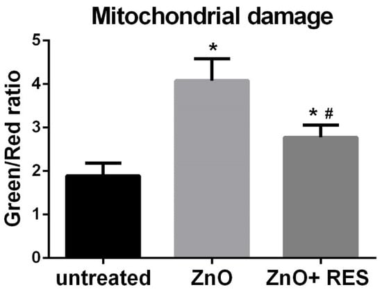 Resveratrol protects mitochondrial function in zebrafish embryos exposed to ZnO NPs. Quantification of mitochondrial damage (green/red fluorescence ratio) in 72-hpf embryos after treatment with 3 mg/L ZnO NP in the absence (ZnO) or presence (ZnO + RES) of 5 μM resveratrol. Embryos were stained with 5 μM JC-1 probe. Fluorescence was measured with a GENios plus microplate reader using a wavelength of 485 nm (excitation) and 535 nm (emission). RES, resveratrol. Values are shown as mean ± SD, n = 5. *, significantly different from untreated; #, significantly different from ZnO.