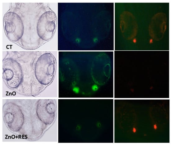 Resveratrol counteracts ZnO NP-induced apoptotic and necrotic fluorescence signals. Fluorescent microscopy images of AO/PI double staining in zebrafish untreated embryos (CT), 3 mg/L ZnO-treated embryos (ZnO NP), and 3 mg/L ZnO + 5 µM resveratrol treated embryos (ZnO + RES). As compared to untreated embryos, ZnO NP-treated zebrafish embryos emit a strong green and red fluorescence signal evidence of increased apoptosis and necrosis, a phenomenon prevented by resveratrol treatment. RES, resveratrol. Magnification 20×.