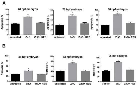 Resveratrol prevents ZnO NP-induced apoptosis and necrosis. (A) Percentage of apoptosis and (B) necrosis in 48, 72, and 96-hpf zebrafish embryos. Twenty four-hpf embryos were treated with 3 mg/L ZnO in the absence (ZnO) and presence (ZnO + RES) 5 µM resveratrol before proceeding with AO/PI double staining for apoptosis/necrosis quantification. Fluorescence was measured at the indicated hpf with a GENios plus microplate reader using a wavelength of 485 (excitation)/535 (emission) for AO and 493 (excitation)/632 (emission) for PI. RES, resveratrol. Values are shown as mean ± SD, n = 5. *, significantly different from untreated.
