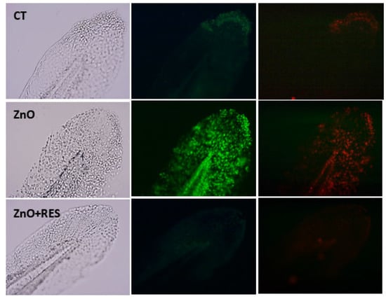 ROS accumulation causes progressive cellular damage and eventually lead to cell death by apoptosis or/and necrosis [46]. Although sometimes difficult to differentiate, necrosis generally occurs in cases of acute and extensive damage with resulting cell lysis and leakage of cell constituents into the extracellular space [46]. Apoptosis, conversely, is a well-regulated form of cell death, which requires an intact plasma membrane and the action of specific proteases and nucleases [46]. Mitochondrial dysfunction, with loss of membrane permeability and integrity, are typical features of apoptosis [47]. Indeed, mitochondrial damage is generally associated with early apoptosis, whereas DNA damage to a later apoptotic phase [47]. In this regard, mitochondria appear as the main target of NP-induced oxidative stress, and the mitochondrial apoptotic pathway (noted as the intrinsic pathway of apoptosis) plays a prevalent role in cell death induced by the metal oxide NPs [47]. To gain mechanistic insight to ZnO NP-induced cell damage in zebrafish, the acridine orange/propidium iodide (AO/PI) assay was carried out to evaluate the prevalence of apoptosis and necrosis in fish embryos treated with ZnO-NP. Quantitative results depicted in Figure 6A,B indicated a high level of both apoptosis (Figure 6A) and necrosis (Figure 6B), providing evidence of ZnO NP ability to induce in vivo damage of zebrafish embryos. The same picture indicates that the NP-induced cell impairment was completely prevented by resveratrol treatment, confirming resveratrol protection against ZnO NP-induced cell damage, and further highlighting that antioxidants may be successfully employed to reduce NPs toxicity (Figure 6A,B). The double staining AO/PI image offers the advantage to potentially discriminate between apoptotic cells, with the intact membrane, and necrotic cells with the damaged membrane. Indeed, apoptotic cells show a very bright green signal because of AO binding to the condensed chromatin in the nucleus, while necrotic dead cells with damaged membrane display a red fluorescence signal due to PI accumulation inside the cytoplasm. Qualitative microscope analysis of zebrafish embryos stained with AO/PI paralleled quantitative data, clearly displaying an increase of both green (apoptosis) and red fluorescence (necrosis) following ZnO NPs treatment, an effect dramatically counteracted by the resveratrol which reported both fluorescence levels comparable to the untreated fish (Figure 7). Again, the current data represent the first evidence regarding the protective effect of resveratrol against ZnO NP-induced toxicity in zebrafish.