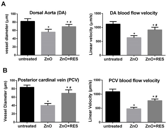 Resveratrol ameliorates cardiac vascular modifications and function induced by ZnO NP. Vessel diameter and blood flow velocity in the two major blood vessels (A) dorsal aorta (DA) and (B) posterior cardinal vein (PVC) was measured in 96-hpf zebrafish embryos treated with 3 mg/L ZnO NP w/wo 5.0 µM resveratrol. RES, resveratrol. Values are shown as mean ± SD, n = 5. *, significantly different from untreated; #, significantly different from ZnO.