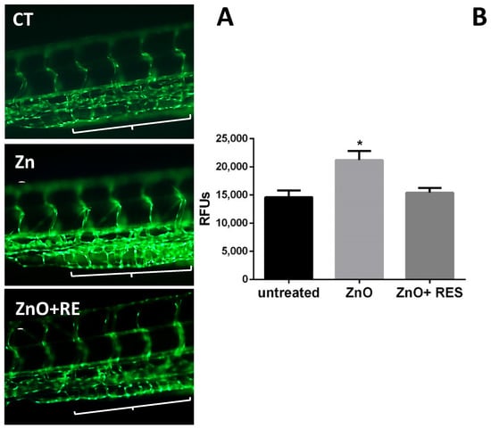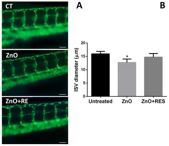 Resveratrol ameliorates alterations in the width of intersegmental vessels. (A) Representative fluorescence pictures depicting intersegmental vessels (ISVs) in the 96-hpf Fli1-GFP embryos exposed to 3 mg/L ZnO-NPs (ZnO) indicting a reduced vessel width as compared to the dimension of the control group (CT). Embryos exposed to 3 mg/L ZnO + 5 µM resveratrol (ZnO + RES) display a decrease in the incidence of modified vessels, which appear both regular and with reduced NP-induced phenotype modification. Scale Bar 50 µM. (B) Quantification of vessel diameter was performed using ImageJ (v1.44 public domain software http://rsbweb.nih.gov/ij/) in 96 hpf embryos. RES, resveratrol. Values are shown as mean ± SD, n = 20. *, significantly different from the untreated. (Magnification 20×).