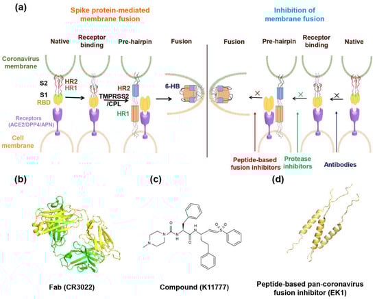 - Xia, S.; Liu, M.; Wang, C.; Xu, W.; Lan, Q.; Feng, S.; Qi, F.F.; Bao, L.; Du, L.; Liu, S.; et al. Inhibition of SARS-CoV-2 (previously 2019-nCoV) infection by a highly potent pan-coronavirus fusion inhibitor targeting its spike protein that harbors a high capacity to mediate membrane fusion. Cell Res. 2020, 30, 343–355. [Google Scholar] [CrossRef]