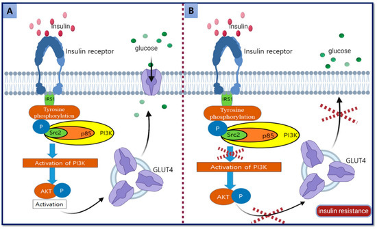 Insulin binds to its receptor at the membrane and activates the components of downstream signal transduction pathways, including insulin receptor substrate (IRS)-1, phosphatidylinositide 3-kinases (PI3K), and AKT, which regulate insulin-mediated glucose uptake from the cytoplasm to the plasma membrane via GLUT4. Disturbance in the signal transduction pathways and consequent GLUT4 translocation results in the development of IR and T2DM [69] (Figure 1).