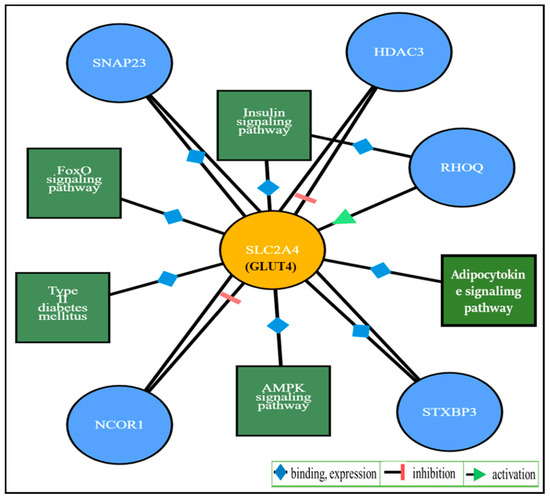 The gene SLC2A4 (solute carrier family 2, facilitated glucose transporter member 4) encodes GLUT4. An interaction study of the SLC2A4 gene, predicted by ProteomicsDB [70], shows its relationship with pathways such as T2DM, FoxO signaling, adipocytokine signaling, insulin signaling, and AMPK signaling, as well as interactions with the protein coding genes SNAP23, HDAC3, RHOQ, NCOR1, and STXBP3. The interacting pathways for these protein–protein interactions with GLUT4 were assessed by automatic mapping of identifiers using STRING [71] and the functional pathways were determined by KEGG [72] as shown in Figure 2.