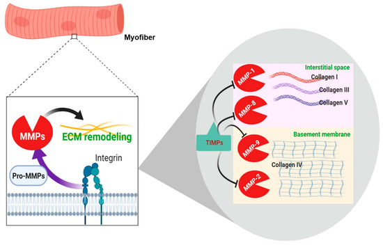 TIMPs are a family of protease inhibitors (TIMP-1, -2, and -4) that act as inhibitors of all recognized types of MMPs [84]. The N-terminal regions of TIMPs bind to the catalytic domain of MMPs and inhibit their action, while the TIMP C-terminal region may interact with the hemopexin domains of MMP-2 and MMP-9 to stabilize the inhibitor complex. TIMP-1 has been reported to primarily inhibit MMP-1, MMP-3, MMP-7, and MMP-9 [85]. TIMPs, mediated by integrins, can modify cell growth and survival in an MMP-independent manner, e.g., TIMP-2, which controls the expression of beta1 integrin and the size of myotubes produced during myoblast differentiation [86]. TIMPs are frequently activated in response to physical activity along with MMPs, representing the instantaneous stimulation and inhibition of the degradation of ECM components. The activation of MMPs accompanies the activation of TIMPs, which act as “guardians” for the termination of degradation, placing limits on the breakdown of ECM [87].