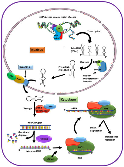 The miRNA biogenesis starts in the nucleus and is completed in the cytoplasm (Figure 1). First, transcription of the intronic gene region with a size of approximately 200 to several thousand nucleotides yields the primary (pri)-miRNA folded into hairpin loops. The nuclear microprocessor complex containing endonuclease (type III RNase) Drosha and the DiGeorge syndrome critical region gene 8 (DGCR8) cut the pri-miRNA into 70–100 nucleotide-long precursors (pre)-miRNA [10,11,12]. Pre-miRNAs are then transported via nuclear pores into the cytoplasm by exportin 5. Next, pre-miRNA is cut into 19-22 nucleotide-long miRNA duplexes by the cytoplasmic endonucleases Dicer and the Trans-activating response RNA-binding protein (TRBP). Finally, a helicase separates the pre-miRNA duplex into a single-stranded mature miRNA that becomes incorporated into the Argonaute (Ago) containing, RNA-induced silencing complex (RISC) to exert the miRNA-mediated interference [13,14]. Although five Ago isoforms have been described, only four are associated with small non-coding RNAs in humans [15,16,17], and only Ago2 controls the miRNA function [14,15]. Ago2 facilitates the binding of miRNA to the target mRNA [15,17,18]. Subsequently, the endonuclease activity of the RNaseH-like P-element-induced wimpy testis (PIWI) domain of Ago2 cleaves the miRNA-mRNA duplex [17,18]. The Ago2-miRNA-RISC complex confers post-transcriptional repression [19]. Initial work suggested that miRNAs primarily inhibit protein translation, but the current model indicates that miRNAs also lead to degradation of the target mRNA [20].